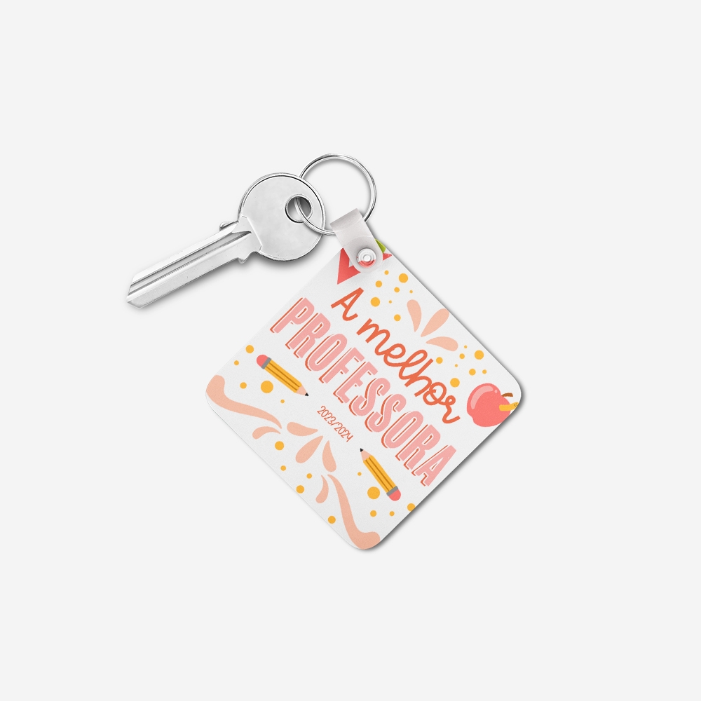 Produzido em acrílico resistente, este porta-chaves combina leveza e durabilidade. A personalização é feita por sublimação térmica nos dois lados, garantindo cores vivas e detalhes nítidos.